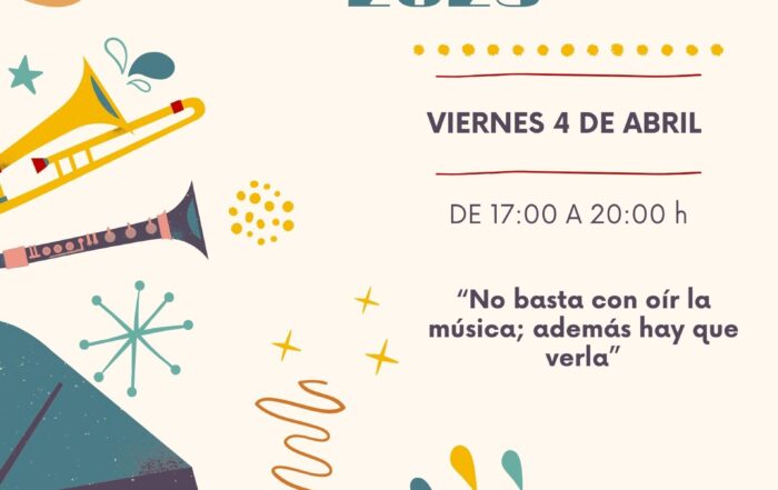 Viernes 10 de abril de 17 a 20 horas. Ven a conocernos, observa de cerca los instrumentos y todo lo que puedes aprender en el maravilloso mundo de la Música. Entrada libre y gratuita